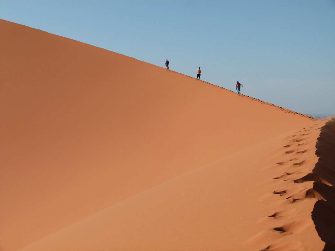 Bei dieser Trekkingtour gab es eine Premiere. Es ging vom Flughafen in wenigen Minuten in die Wüste zu unserem Zeltlager und am Ende der Tour nach dem Abendessen in der Wüste direkt zu Flughafen für den Heimflug. So hatten wir zwei Wochen intensives Wüstenerlebnis. Diese Tour führte uns in die Zentralsahara, dem Südosten von Algerien. Zuerst waren wir drei Tage um Janet unterwegs, wanderten durch einen großen Canyon. Bei einer Tageswanderung von Rand des Tassili n´Ajjer ins Erd Admer tauchten wir erstmals in eine reine Sand- und Dünenlandschaft ein. Aber unser Hauptziel war das TADRART, wo wir auf Kamelen reiten oder zu Fuß eine abwechslungsreiche Landschaft mit immer neuen Höhepunkten erlebten. Von reiner mondähnlicher Felslandschaft bis zu Fels und Sand gemischt und natürlich reine Sandlandschaft mit hohen Dünen. Sand gab es in verschieden Farben von hell bis ziegelrot. Unterwegs sahen wir auch viele spektakuläre Felsmonumente wie Säulen, Spitzen und Felsbögen. Auch viele Gravuren und Malereien (Elefanten, Giraffen, Menschen auf der Jagd, Rinder, ca 5000 – 8000 Jahre alt), sowie Siedlungsreste wie prähistorische Tonscherben, Mahlsteine, Faustkeile und Pfeilspitzen konnten wir entdecken. Selten stellte ich mein Zelt am Abend auf, ich schlief meist im Freien unter einem unbeschreiblich schönen Sternenhimmel.